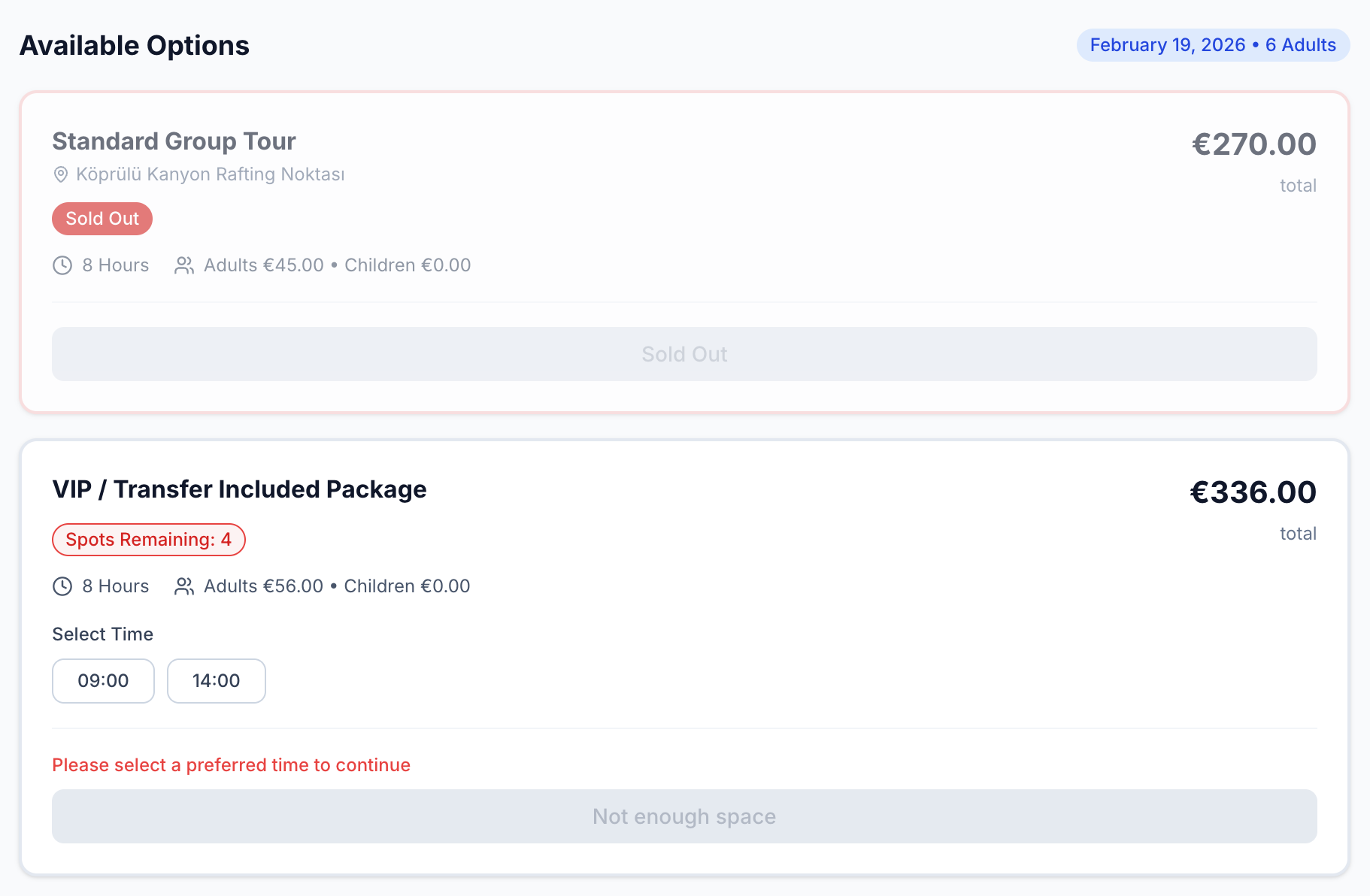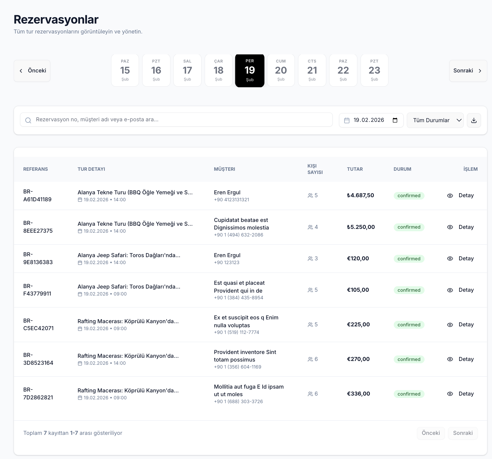 Tur kapasitesi dolduğunda sistem otomatik olarak "Tükendi" etiketi basar ve rezervasyon butonunu kilitler. Müşteri mağduriyetine son.